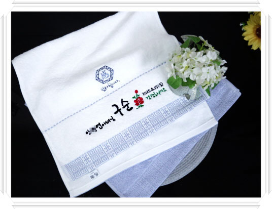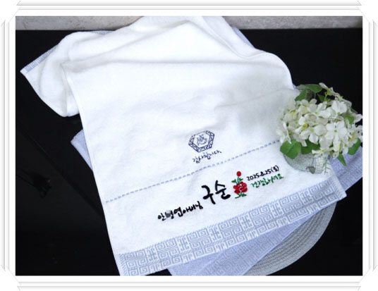 그래서 그 무명실로 만들어진 디럭스 /복/ VIP타올에 어머니 또는 아버지 성함과 날짜를 문구로 새겨서 나눠드리고 오래오래 기념을 하시면