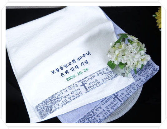 교회창립과 은퇴 임직식을 할때는 교회 이름과 임직자 명단 도 들어가기때문에 대충 싸구려 수건에 제작을 하지 않습니다 ㅠ