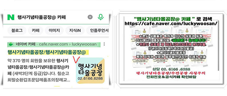 초록창에서 아래 처럼 검색후 수건공장 카페에서 수건가격이나 제작 사례나 스티커 후기 등을 참고하세요