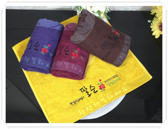 구순답례품 으로 수건 을 제작해서 나눠드리고 상당히 좋은 반응을 얻었습니다 ~~^^라고 말씀을 하시는분들이 상당히 많습니다 특히나 다른곳도 아니고 타올공장 에서 만드는 수건 들은 상당히