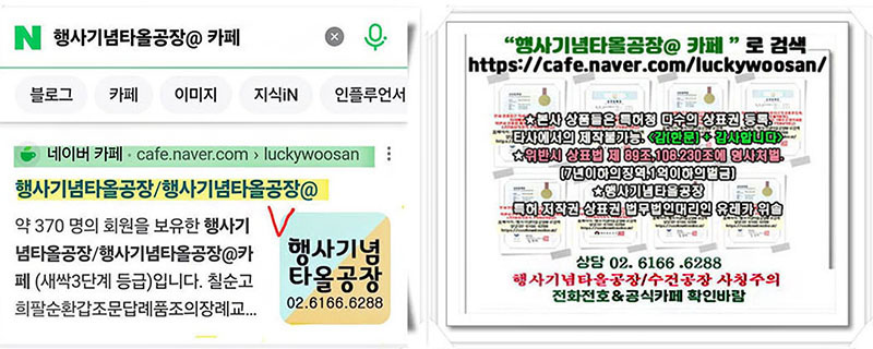 네*버에서 검색을 해서 카페 로 들어가 보시면 수건가격이나 제작 사례 & 후기들이 1만개정도가 쌓여있어서